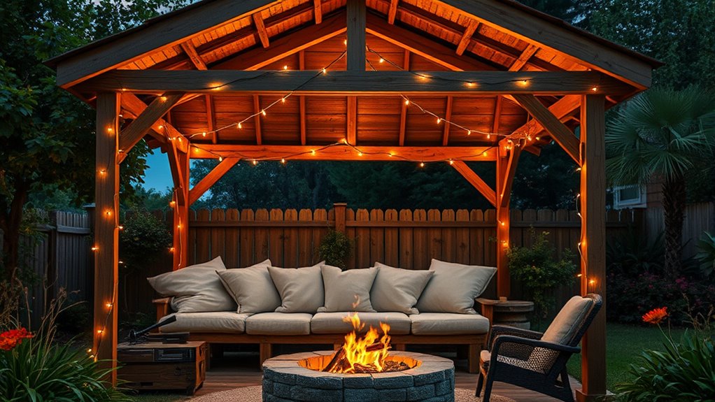 For hosting unforgettable movie nights, choose a spacious gazebo that fits your style—modern designs with sleek lines or rustic wooden options for a cozy vibe. Think about open versus enclosed styles: open gazebos connect you with nature, while enclosed ones protect against weather and pests. Don’t forget to add dimmable lights and comfy seating. Accessorize with blankets, snacks, and even a portable sound system. Keep exploring ideas to transform your outdoor space into a cinematic paradise!