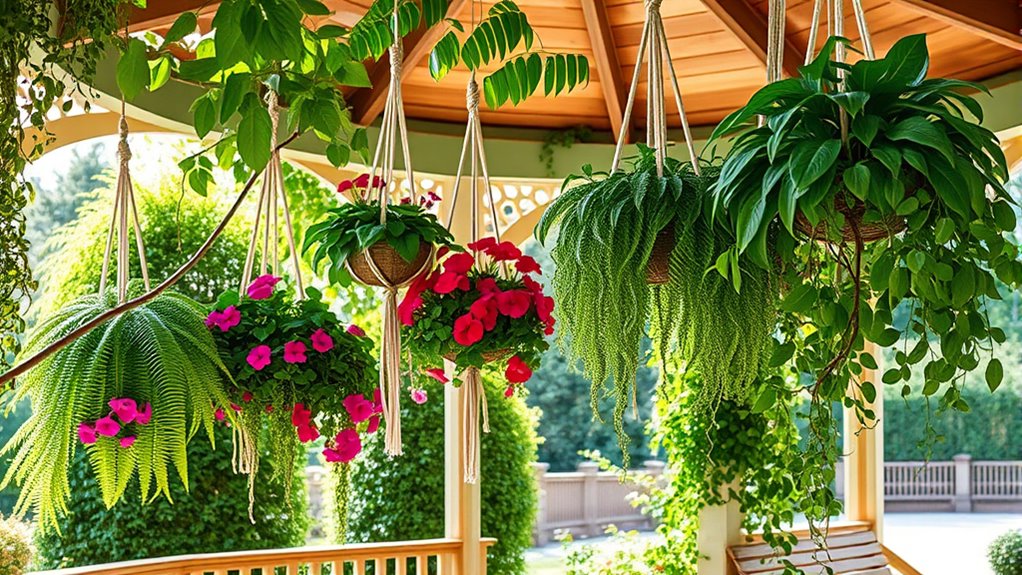 Also, think about mixing textures and colors for visual interest; this allows you to express your personal style while enhancing your gazebo’s aesthetic. With the right selection, your hanging garden can become a lush, inviting sanctuary that reflects your desire for freedom and connection to nature.