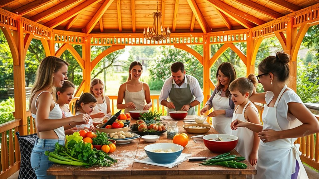 Hosting a family-friendly cooking class under your gazebo is a fun way to bond with loved ones. Choose versatile recipes, like homemade pizza or colorful fruit skewers, to engage all ages. Set up your space for comfort, with prep stations and proper ventilation. Gather essential supplies and create interactive activities, like a Mystery Ingredient Challenge. Enjoy the fruits of your labor together, celebrating traditions and memories. Discover more ways to enhance your culinary experience!