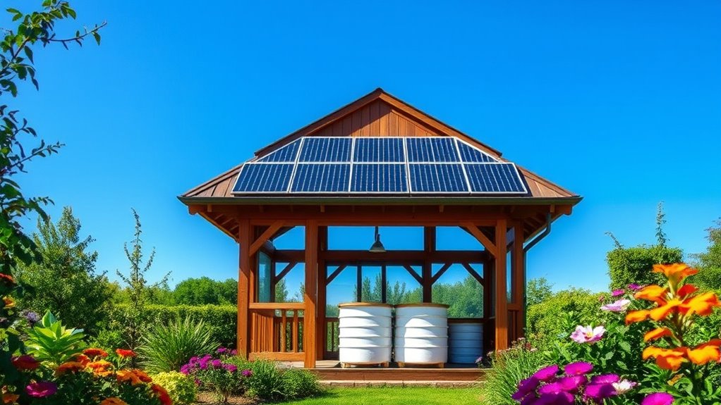 To design an energy-efficient gazebo, start by selecting sustainable materials like reclaimed wood or bamboo, which reduce your environmental footprint. Maximize natural light with large windows and skylights for better ventilation. Incorporate green landscaping with native plants and permeable walkways to support local ecosystems. Install energy-efficient features such as solar panels and rainwater harvesting systems. Finally, guarantee your gazebo is adaptable for different seasons with adjustable shades and quality insulation. You’ll uncover more tips and tricks as you explore further.