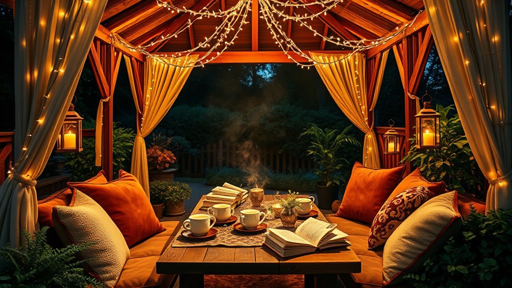 Don’t forget about weather-resistant fabrics to guarantee your seating holds up against the elements. You can layer in picnic blankets and hammocks for added comfort and relaxation. With the right setup, your gazebo will be the ultimate cozy retreat for book lovers!