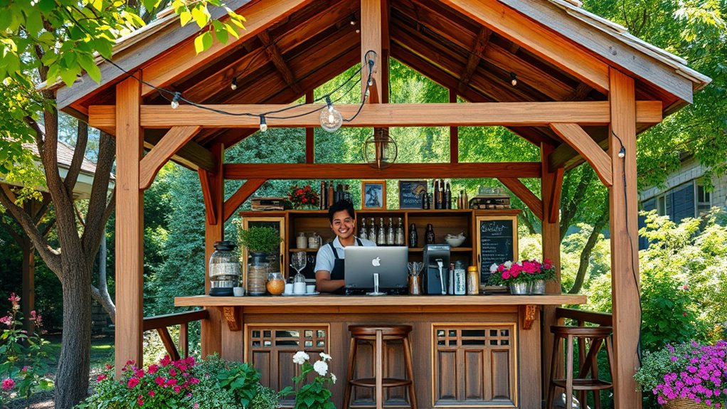While you might think of a gazebo as just an outdoor structure, transforming it into a cozy coffee kiosk involves thoughtful decor choices that invite relaxation and conversation. Start by selecting comfortable seating—think plush cushions on benches or inviting lounge chairs. This encourages patrons to linger a little longer over their coffee.