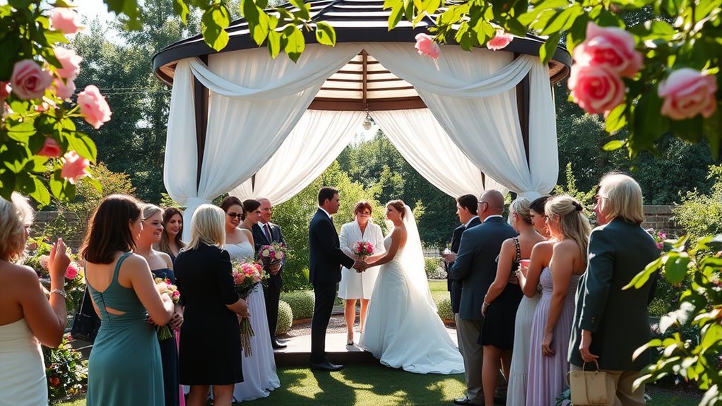 While the aesthetic appeal of a gazebo can elevate an outdoor wedding, its practical function as a shelter from unpredictable weather is equally important. Imagine exchanging vows with the sun shining, only for dark clouds to roll in unexpectedly. A gazebo offers essential weather protection, allowing you and your guests to enjoy outdoor comfort regardless of sudden changes. With its sturdy structure, you can rest assured that light rain or unexpected gusts won’t dampen your special day. Plus, the shaded space creates a cozy atmosphere, enhancing the intimacy of your ceremony. By incorporating a gazebo, you not only embrace nature’s beauty but also safeguard your celebration against the whims of weather, ensuring a seamless experience for everyone involved.